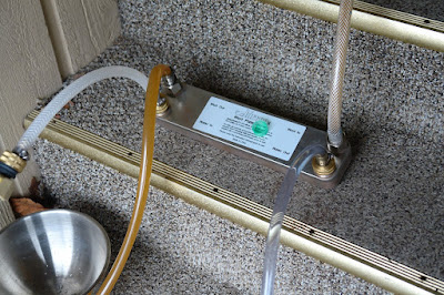 And the plate-chiller in action.... It's a happy miracle of physics, the way boiling hot wort enters from up the stairs, and 20°C wort comes out the other side. It saved an immense amount of time and water, and is extra-awesome for working the same way as penguin feet.